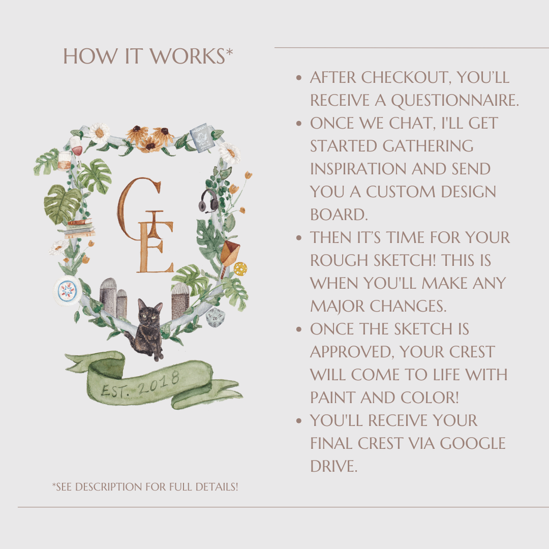 - Within 24 hours, you will receive a questionnaire in your email to help me get an idea of what you're looking for in your crest.